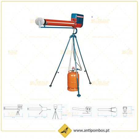 Modelo em sistema de canhão a gás que funciona com gás butano ou propano, que permite efetuar disparos audíveis a longas distâncias no sentido de proteger os cultivos e espantar todo o tipo de animais que se possam tornar uma ameaça (pássaros, javalis, outros animais...)